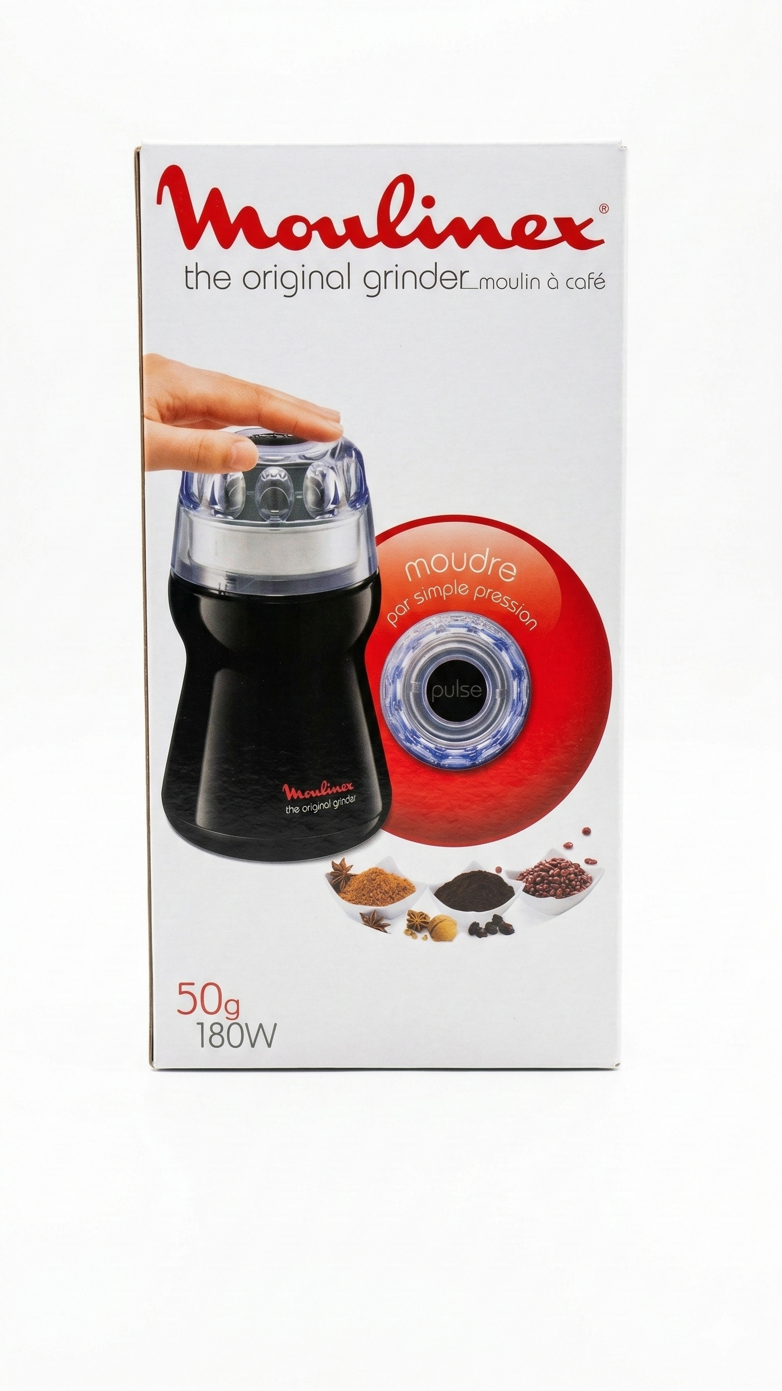 احصل على قهوة مطحونة طازجة في ثوانٍ مع مطحنة القهوة Moulinex بقوة 180 واط. تصميم عملي وصغير الحجم يسمح بطحن القهوة، التوابل والمكسرات بسهولة بفضل نظام الضغط للتشغيل (Pulse)
